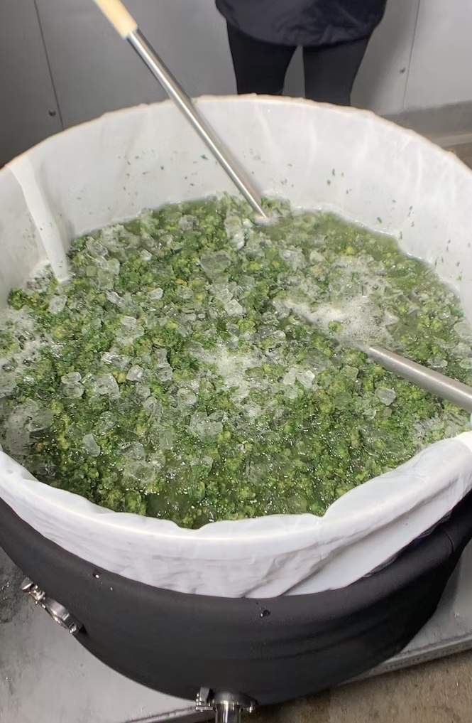 Fill the bucket with ice water, add frozen trim, mix it for 15-20 minutes until the water looks golden-brown. Pour everything through your bags from biggest to smallest micron.